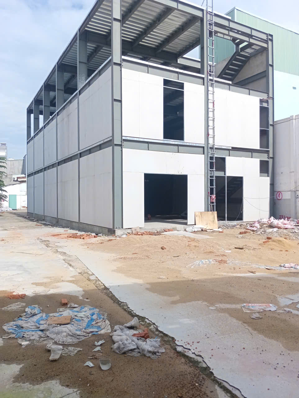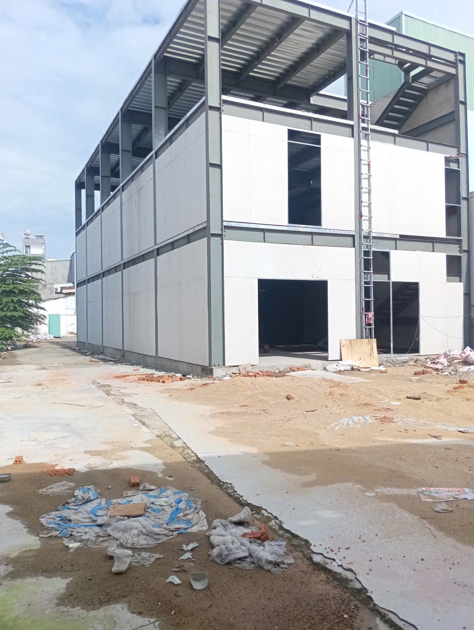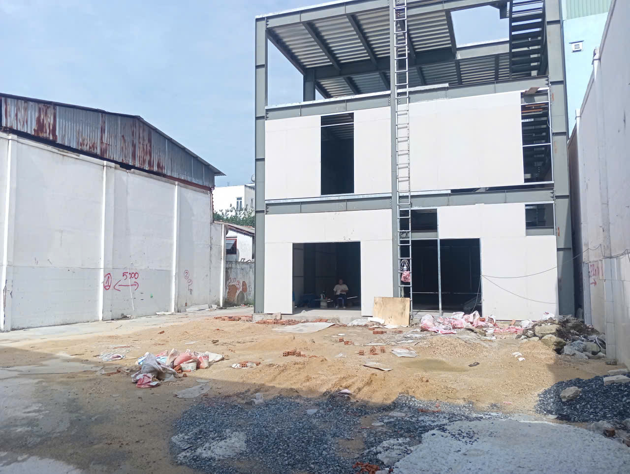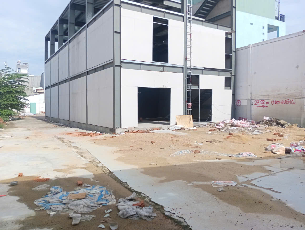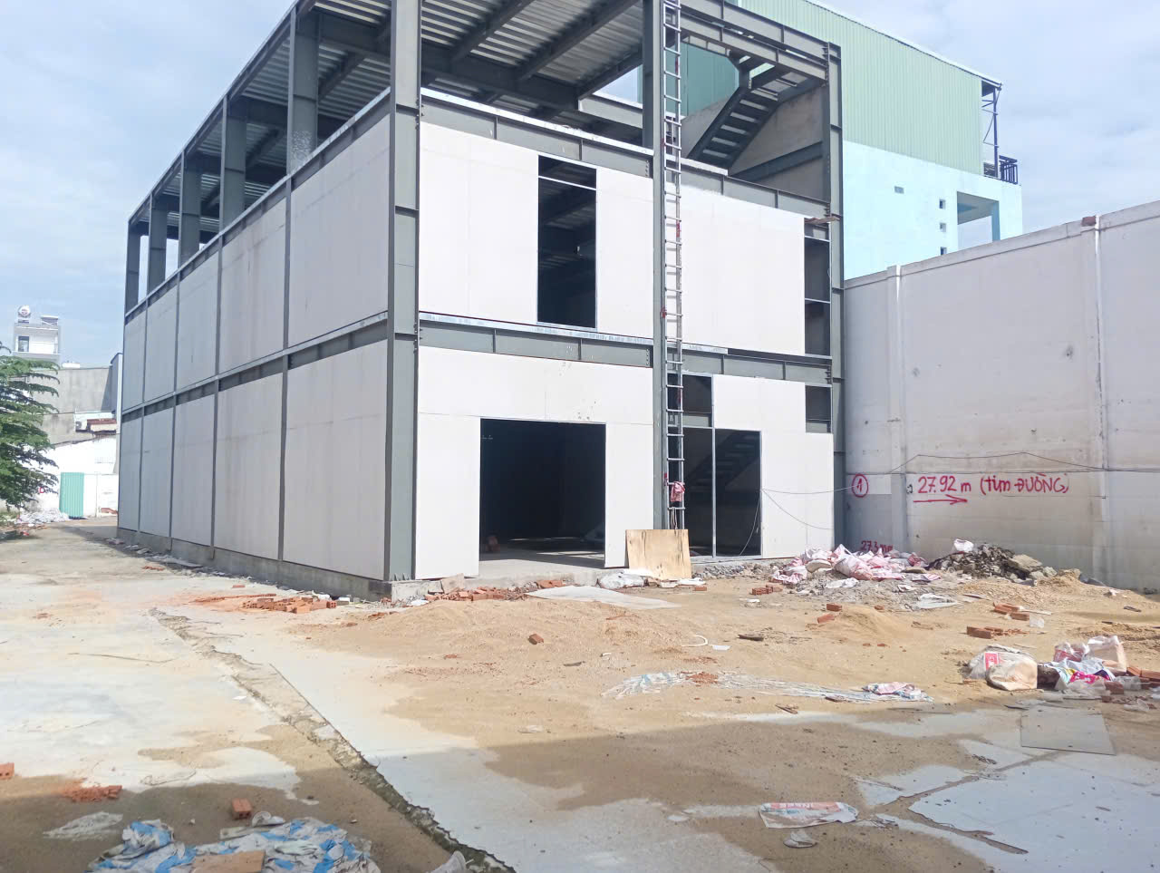 - Hiện trạng : Công trình đã hoàn thiện thô. Nhà 1 trệt + 2 lầu. Còn lại đất trống chưa có mái ( Chỉ được xây dựng bạt kéo )
